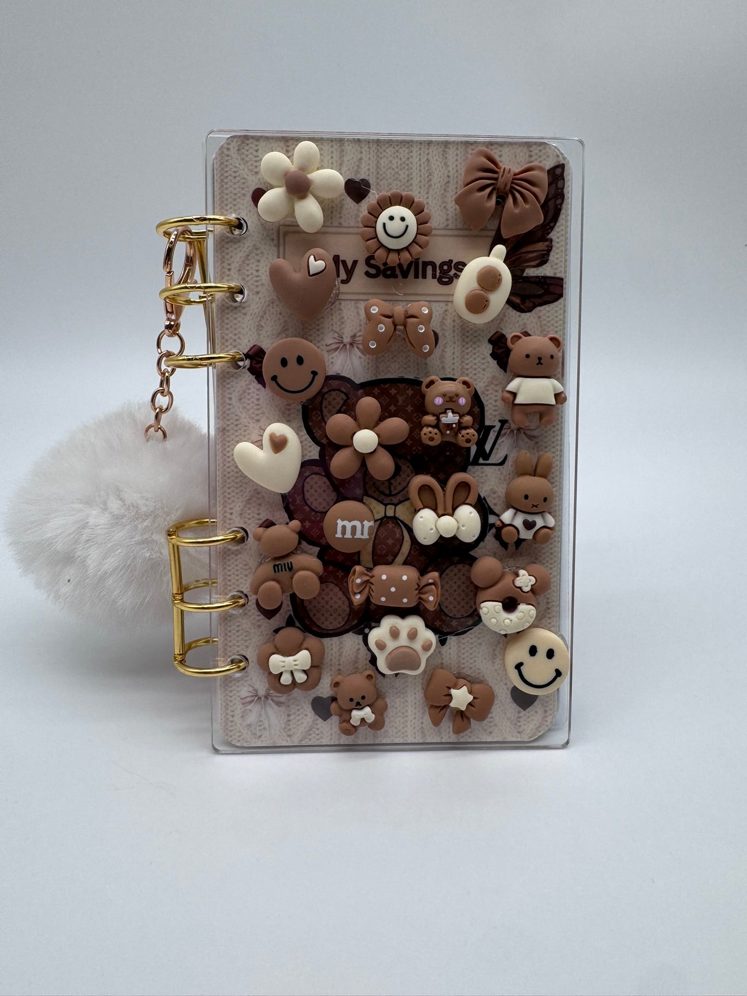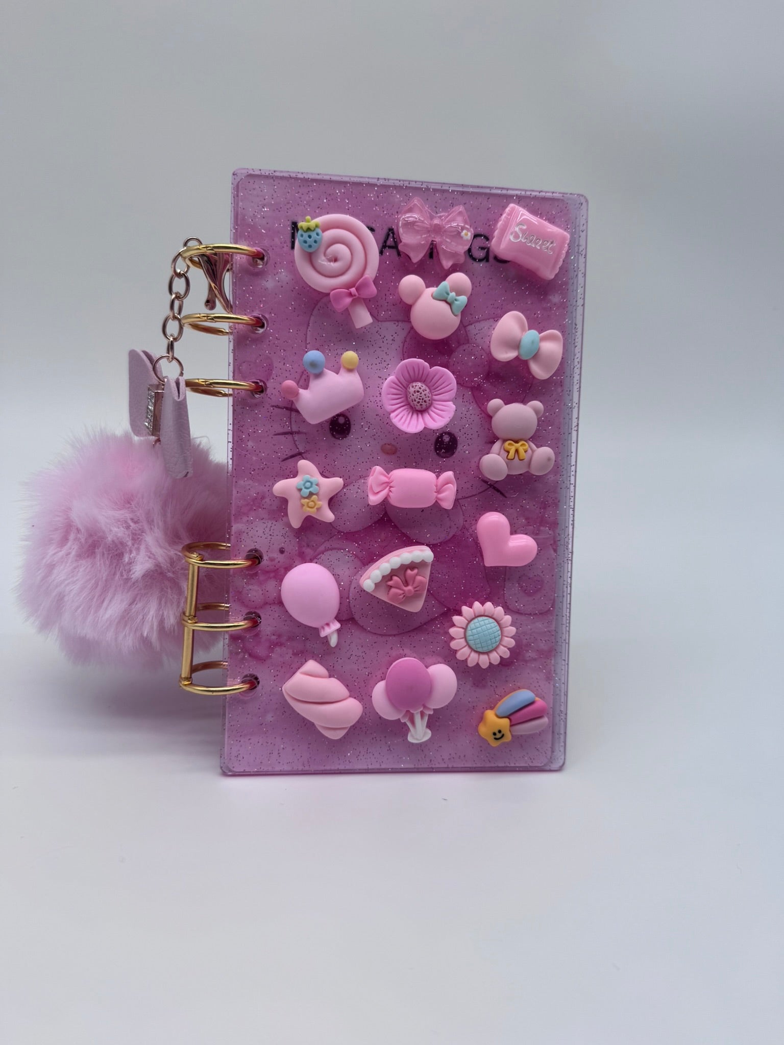 Each binder is handmade and carefully decorated, featuring a mix of dimensional charms, pearls, bows, sweets, animals, florals, and soft pastel embellishments.
